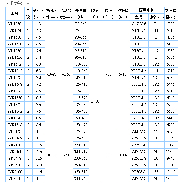 1、YK型塊偏心圓振動篩系YA型軸偏心圓振動篩的更新換代產品,有20個定型規格并分別有敞開型和封閉型兩種結構形式。本系列振動篩有輕型和重型之分,適用不同物料粒度級別的篩分,選用時請確定電壓制式及有無防爆要求;