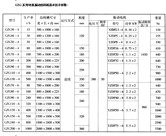 GZG系列電機振動給料機基本技術參數